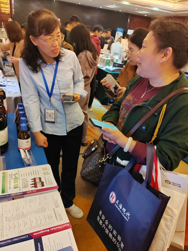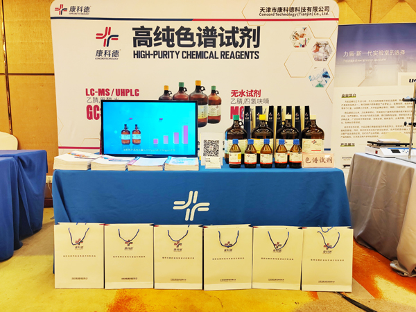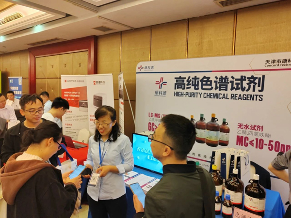 康科德展出的液質聯用試劑、超純色譜試劑、色譜梯度試劑、卡爾費休試劑等系列產品引起廣泛關注,前來康科德展臺的老師絡繹不絕。工作人員通過產品的各項數據指標和實際案例向大家展示出康科德產品檢測數據穩定、超低雜質、超低蒸發殘渣等優勢。許多參會的專家老師對康科德的產品表現出濃厚的興趣,并表示出合作意向。